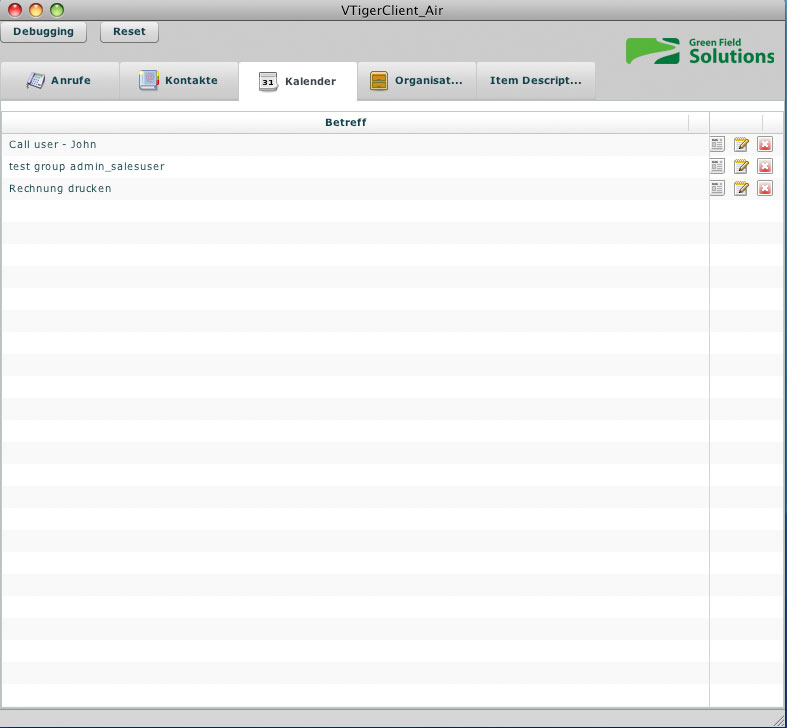 Es lassen sich Features des Vtiger-CRM bequem innerhalb einer Flex- oder Air-Applikation nutzen und mit anderen Applikationsmodulen vernetzen. Ausserdem lassen sich leicht kleine Widgets erstellen um einen schnellen Zugriff auf z.B. Tasks, Termine, Anrufe oder Kunden zu erhalten. Screenshots: ![]() ![]() |