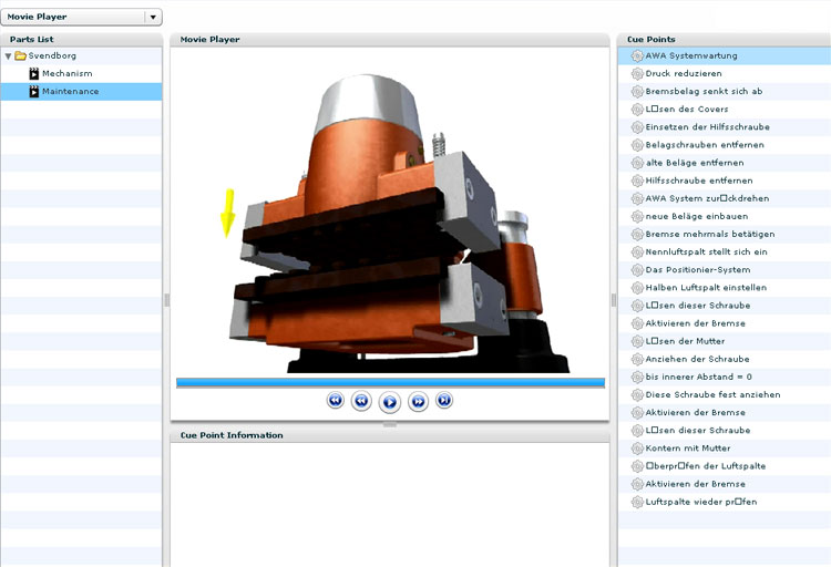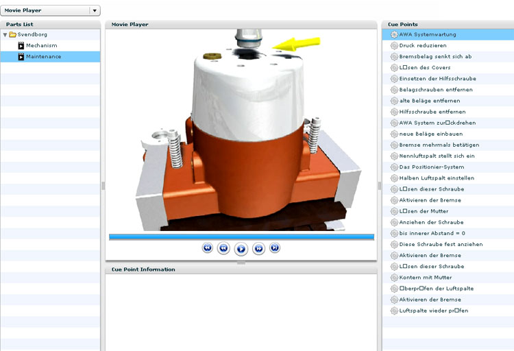 Der Media Player wird für Training und Schulung und technische Visualisierungen genutzt um Videos, Bilder und unterstützende Texte zusammen zu bringen. Die Texte können an bestimmten Zeitmarken im Video aufgeblendet werden.